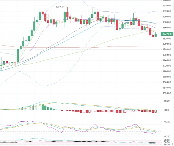 昨日给到的高空思路也是成功的拿下低点目标,结合盘面4小时走势来看,空头能量柱缩能减量,kdj三线在下方有聚拢向上运行的迹象,rsi三线均已转头向上,从日线级别来看,多头能量柱缩能减量,macd双线呈向下转头迹象有概率走死叉的趋势,rsi三线均在中轴下方拐头向上,短线或有一点的反弹需求。综上所述,日内行情可能会在1880-1820区间现成一个震荡走势,那么日内交易建议参考区间点位去高抛低吸,预留补仓位即可。