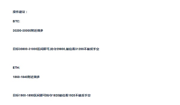 昨日大饼和以太整体走势相对来说还是比较弱势的,走了一个震荡下行的节奏,从早间大饼开盘最高30700一线,一路震荡下行跌至29800附近,随后快速反弹,目前币价有效企稳30000上方震荡修复运行。在凌晨大饼下跌试探了一下29800支撑位,随后开始反弹,虽然位破支撑,但是最近大饼表现出来的走势确实很弱,或许我们应该改变思路,但是我们想想在多次跌破30000下方后都能反弹上来,可见大饼已经是站稳30000的,只能说上涨前夕的一个震荡回调,个人认为在磨韭菜和主力的耐心,当我们抛之,行情必定会迎来新的突破。昨日在文章给的操作的思路中,我们也是给到回踩30000-32000去做多,整体的走势也是比较符合我们预期,目前币价再次来到30100一线。行情依旧有上行的预期。以太的回踩低多,也是遗憾打损了,失败不可怕,可怕的是不承认。人无完人,没有十全十美,没有一直的常胜将军,在失败中吸取经验和教训,在告诉大家币圈不缺机会。废话不多说了,咱们看看盘面走势情况