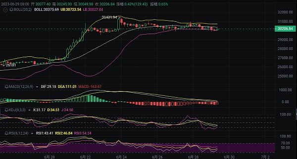 从4小时图来看,目前行情处于弱势环节,整体布局还是围绕弱势环节对待,布林带收窄口走平状态运行,币价在二连阴下探后,虽略有反弹,可见反弹力度并不大,在触及中轨压制后快速给到回落,K线出现向下插针试探底部29800附近短线支撑,KDJ和RSI三线有拐头向上运行的趋势,MACD空头能量柱持续放量,短线来看行情属于震荡上行后的区间回落,行情回踩支撑未破且形成下插针,短线行情有反弹趋势,操作建议还是回踩支撑位附近做哆看反弹空间,看力度再去接空操作即可!