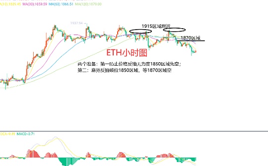6月29日以太坊(ETH)合约技术面分析:今日方面,大周期日线级别昨日报收小阴线,K线形态上还是单阴单阳,但价格还是向下破位了,虽说力度不大,但价格是处于低位的,那么今日能否延续向下继续破位就是关键了,附图指标多头动能持续缩量运行,趋势上下跌是有优势的;短周期小时图前一日凌晨价格冲高回落,欧盘横盘整理美盘延续向下破位,这样来看今日两个准备,第一:价格反抽1850区域空,止损1870区域,目标看1805区域;防止价格反抽没有力度,而1850区域是四小时图均线阻力位置;第二:如果欧盘价格反抽力度过大,破位1850区域,那么等1870区域空,止损1891区域,目标看1830-1815区域