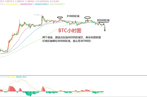 6月29日比特币(BTC)合约技术面分析:今日方面,大周期日线级别昨日报收小阴线,K线形态上还是单阴单阳暂时都看不到延续行情信号,价格还是在区间之内,即使昨日下跌但还是在前期低点位置附近,并没有强势破位,较为明显的是,昨日的下跌价格承压明显且没有反弹力度,附图指标多头持续缩量运行;短周期小时图整体走势还是在区间之内,上方高点31000区域,低点29500区域,而昨日美盘高点位置在30500区域附近,凌晨后价格回撤向下,所以今日继续看延续下跌的话,就需要激进一点了,注意两点:第一反抽30200区域附近空,止损30550区域,目标看29600-29500区域;第二:如果欧盘价格反抽破30500区域,那么等30700区域空,止损31050区域,目标看30000-29800区域;