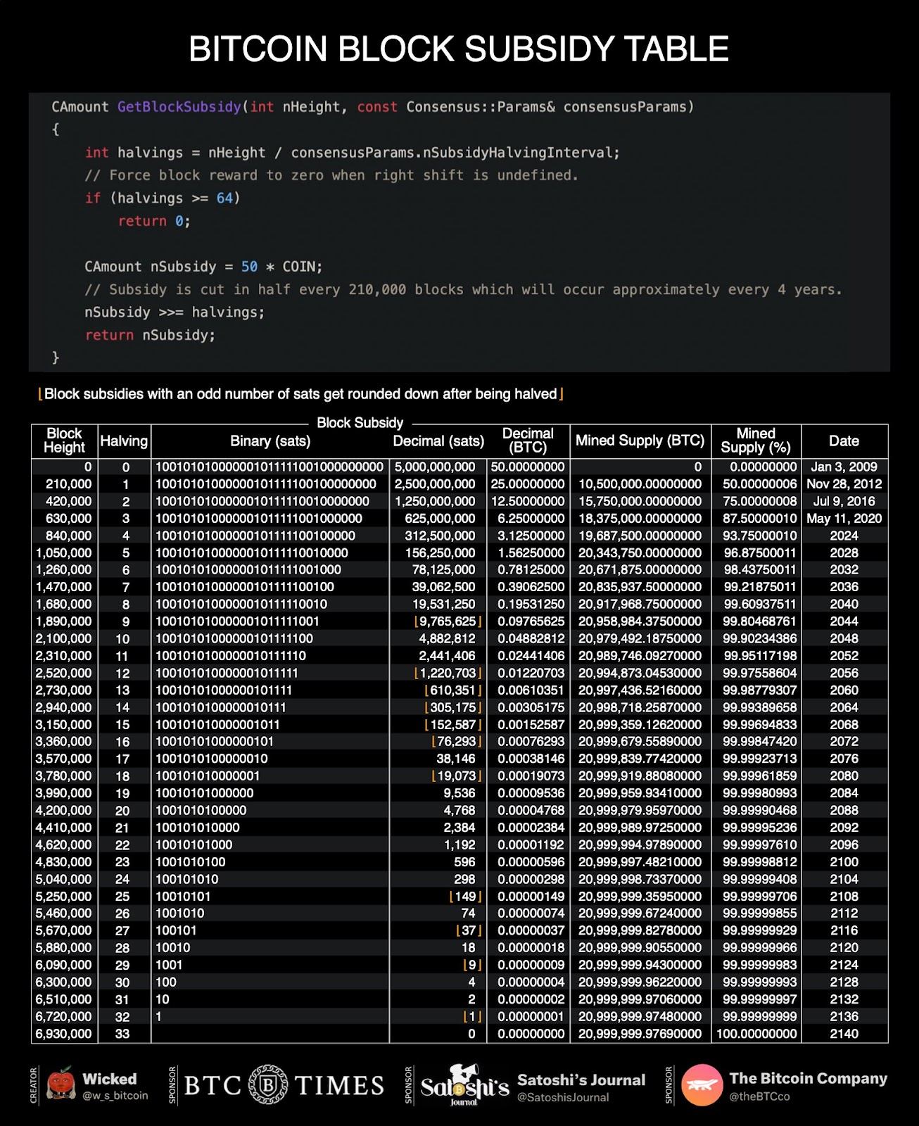 比特币的区块奖励大约每四年减半,这个图表显示了区块奖励在一段时间内的进展情况