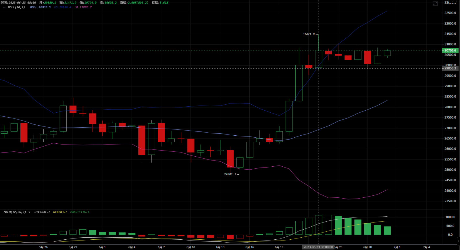 昨日早间给出大饼30000左右直接多,日内大饼整体走势也是一路震荡上行最高来到了30800附近运行,但并未延续而是一路震荡下行最低来到30200一线后快速反弹,目前币价稳在30500左右震荡运行中。