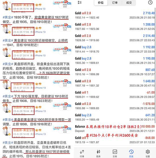 本周26美金利润完美收官:(由于本周给出策略较多,只截图重要策略,策略实时全网公布,绝非空穴来风,张晶霖希望大家能一探真伪)本周我们的思路非常明确的,顺势做空,反弹做空,肯定是没有问题的,除了周五以外。周五我们1901附近是看多的,也做了1903的多,但由于本周美盘都是直接下跌或冲高回落,加上趋势偏空的情况,我们在1907附近做了反手空单,算是一个失败。本周我们共操作10单补仓2单(8胜2负),折算盈利26个点(单手利润2600美金)。每日的操作思路均全网提前公布。如果近期操作不如意的朋友也不用遗憾,我们中线布局(1932附近空单)已经开启,其中的利润空间仍不可估量,绝对又是一次资金多倍利润的机遇,张晶霖期待你的加入。