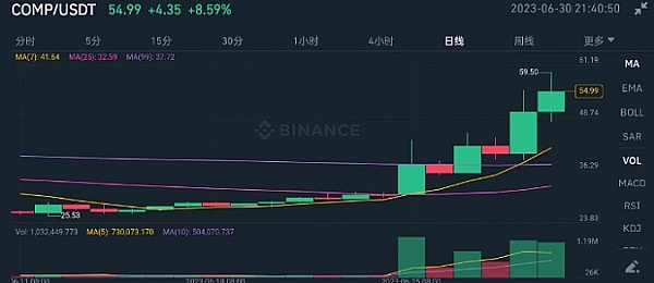 从今年 6 月 17 日到 6 月 30 日,作为 DeFi 1.0 龙头的 Comp从 27 USDT 一路升到最高点 59.5 USDT。尤其是 6 月 25 日到 6 月 30 日这六天,最大涨幅约在 100% 。如下图: