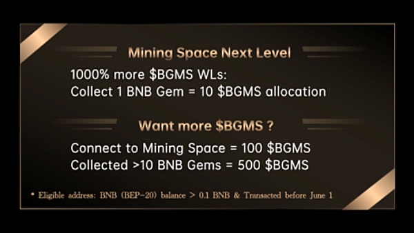 1. 从现在开始,每挖取1个宝石可分配得到10个 $BGMS 代币分配