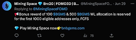 2. 最低成本(25u)获得700个$BGMS: 找一个6月1日前有交易的地址,存入 0.1BNB(25u以下),连接钱包、进行游戏、挖取10个宝石(早期等级成本10u以下,如果等级结束还可立刻返还60%,然后再提现回钱包,花两笔gas不到0.1u),完成这两步应该就有700个白名单了(10个宝石=100+500,存入0.1BNB连接钱包=100)