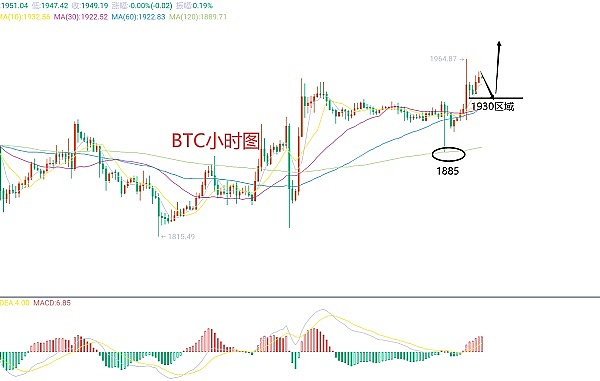 7月3日以太坊(ETH)合约技术面分析:今日方面,大周期日线级别昨日报收小阳线,K线形态上连阳上涨,且价格在震荡上行的节奏当中延续向上破位高点,附图指标有二次放量向上的迹象,那么这样来看趋势有一些迹象了,而前期的低点支撑位置还是在1820区域;短周期小时图凌晨价格探底回升低点1885区域,早间延续上涨且破位前一日高点,而回撤修正的低点位置在1930区域,当前K线形态上连阳,附图指标金叉运行,所以今日我们还是看看延续;因此今日ETH短线合约交易策略:回撤1930区域多,止损1905区域,目标看1965-1980区域;