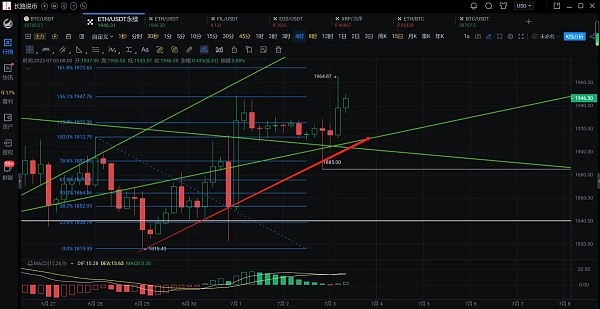 以太坊上个交易日白盘整体处于震荡修复中,晚盘插针1885附近反弹,今天早间强势拉伸1964承压回落,现位于1935附近震荡。