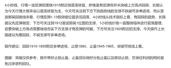 昨天长路在文中给出的先看回踩,可在1895-1910附近多单进场的策略,跟上操作的朋友,多单完美进场可拿下一波利润。