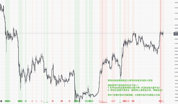 2. 等待衍生品指标出现买入信号,手动分批买入BTC以及少量优质山寨币现货。买入信号具体见图中解释。