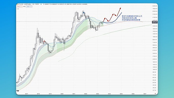 图中是在月线上BTC走势的合理推演 不同分析方法可以推演出不同的走势结果。我个人操作主要会依赖衍生品数据。
