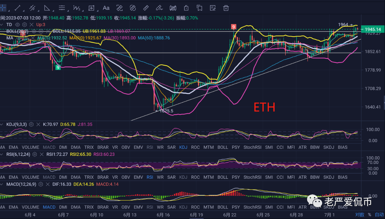 短期以太四小级别来看,K线形成阶梯式上涨形态;价格虽有试探下行,且并未企稳向下发展,反观盘面下方收出较长下影线,行情走出近期区间震荡回到上轨运行,价格再次直逼2000关口;整体走势多头依旧强势,但2000附近位置承压比较明显,不排除随时回撤可能;看多但不建议盲目追多,日内操作思路保持低多进行即可。