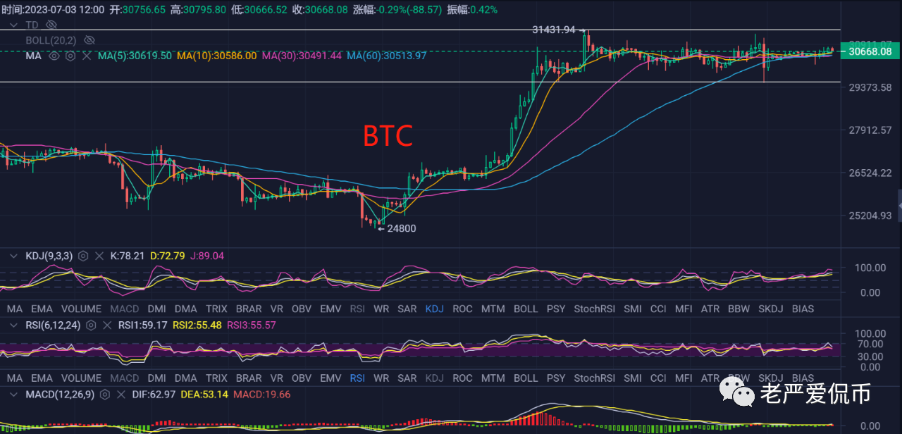 4小时布林带处于开口期,MA均线向前延伸,KDJ随机指标三线向上,走势上处于震荡偏强状态,上方可先关注30900压力测试。日线收盘大阴后面没延续,价格也没有破前期低点,而是反复测试后企稳,从阴阳线和吞噬来说,走势支撑相对偏多的味道慢慢重起来了。指标上来看,目前所有指标都处于一个和平阶段,多空双方都没有太大优势。目前我们知道突破31000那么上一个阻力位值就是33000,如果没有突破那么有可能出现双顶回落的迹象,下方则有可能回调到29000附近的位置,震荡行情大方向依旧看周线级别和月线级别我们昨天制定的计划执行,低多思路执行即可