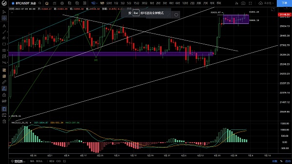 大饼昨日白盘波动不大,低位回踩至30568一线后支撑反弹,晚间行情加速拉升至31376一线受阻回落,目前币价在31070附近运行,四小时级别经过几天震荡盘整后行情连阳拉升破位前期高点,虽承压回落但实体未有效跌破箱体,macd多头运行但没有量能,ma均线向上发散,短期行情处于31000上方运行,整体多头表现较为强势,日线级别来看突破箱体上沿,上方先关注31500若突破有机会去到31700-32200,目前暂不考虑做空,低位多单继续持仓,思路依然看涨低多为主高空为辅,上方压制31500-32200,下方支撑31000-30750