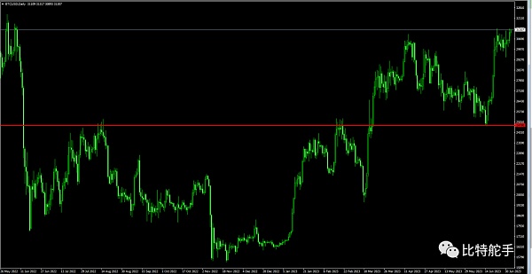 昨日币价波幅较小,整日走震荡上行,最高触及前期高点31400附近,日线收出上下影线均长的小实体阳线。