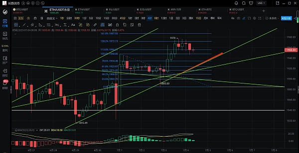 4小时线昨天行情白盘反弹1978附近开始震荡运行,虽有多次反弹并未突破前高回踩,价格并未站稳斐波那契回撤线1.382位置,而现在位于假突破位置运行,今天有继续回踩下方支撑的趋势,下方可关注到斐波那契回撤线1及0.786附近的支撑,不跌破上涨趋势线则可多单进场,以太坊上方面临着月线中轨1975的压制,而从比特币来看已经站上了月线中轨的支撑,若能站稳,不跌破28600附近的支撑,那么则可以确定上行趋势,有机会带动以太坊上行,呈现积极向好的局势,往年的7月也是行情较大的一月。而随着1小时线布林带的缩口,行情则会呈现震荡运行的态势,今天操作上长路建议先看回踩,不破下方支撑可多单进场。