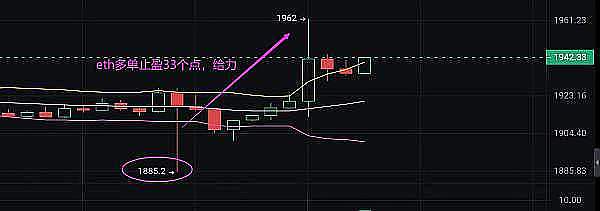 恭喜,eth 昨天在1912现价布局的多单,完美到达止赢目标1945,止赢33个点,给力!如图,布局图: