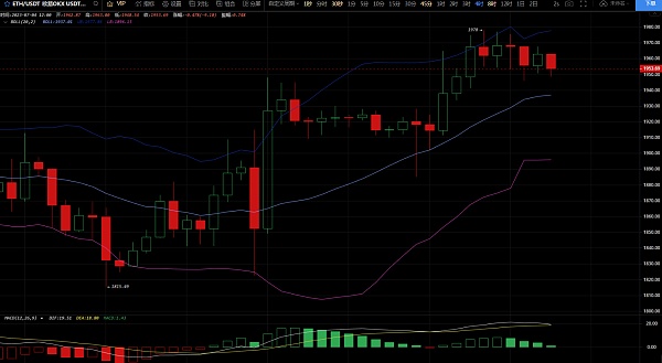 以太在昨日早间先是承压1960附近立马下探插针至1910附近后企稳,随后行情展开震荡缓慢上行,直到午后币价上探创新高至1970附近,后并陷入震荡横盘,凌晨行情承压小幅回落至1950附近,现币价位于1950附近运行,四小时级别以太坊多次试探都未能突破1980压制,随后走出连阴回落跌至ma7下方,macd多头减弱空头增强双线粘合呈有死叉迹象,但回踩力度不大,日线来看macd处于零轴上方双线呈金叉状态,整体盘面来看多头依旧占优,思路建议关注回踩力度低多为主高空为辅