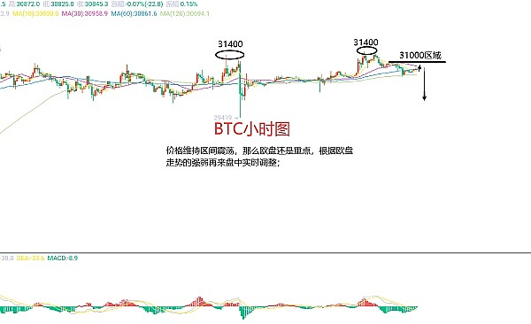 7月5日比特币(BTC)合约技术面分析:今日方面,大周期日线级别昨日报收小阴先,K线形态上单阴单阳这不难看出延续性差的问题吧!价格处于高位震荡,附图指标多头动能缩量,快慢线有粘合死叉迹象,当前问题还是我前面讲的指标不统一就做不了趋势单;短周期小时图前一日欧盘价格承压回撤在破位日内低点后凌晨二次下跌早间延续,低点位置在30600区域附近,二承压的高点位置在31000区域附近,前期高点在31400区域附近,这样来看区间操作就以高点防守,低点止盈即可:因此今日BTC短线合约交易策略:反抽31000区域空,止损31400区域,目标看30500-30350区域;