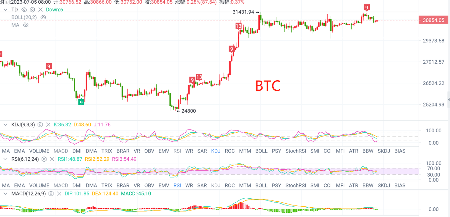 比特币以太坊昨日整体在午后开始震荡下跌,其回踩走势在前文中已给到先前预测,无论是多或空的变化,行情不会一往无前,总会伴随调整震荡出现,大饼重回30000附近维持了13天的震荡,多次冲高失败,昨天看回调今天已经出现小幅回落,整个盘面还是维持走高位震荡,我们的操作也只能高抛低吸,5日线走了一个抛砖引玉形态还是比较乐观,日线走了一个1浪冲到31431,正在进行2浪调整。看是否3浪能如期起来。今日参考29000-33000区间下方看整数关口30000的支撑位置,上方看阻力位值到33000附近。