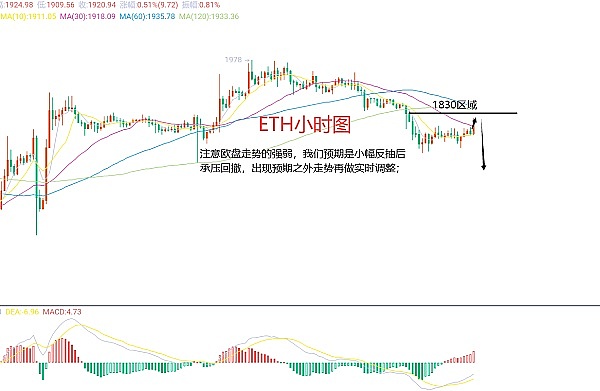 7月6日以太坊(ETH)合约技术面分析:今日方面,大周期日线级别昨日报收小阴线,K线形态上连阴下跌,附图指标多头缩量运行,但需要注意的价格依旧还是震荡在高位,所以目前虽说价格承压有回车迹象,却不明显,还需要关注其延续性和爆发破位的情况;短周期小时图前一日价格在欧盘承压低点位置是破位了1900区域但延续性不强,美盘横盘震荡,当前价格反弹修正,高点开跌口位置在1940区域附近,所以今日看延续的话一样反抽力度不能大且不能破位昨日的开跌口位置:因此今日ETH短线合约交易策略:反抽1930区域空,止损1948区域,目标看1880-1865区域;