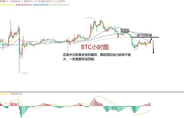 7月6日比特币(BTC)合约技术面分析:今日方面,大周期日线级别昨日报收小阴线,K线形态上连阴下跌,附图指标快慢线有粘合死叉迹象,但价格没有出现较大得爆发向下破位还是处于高位震荡横盘,只有在破位前期低点趋势才会更加明朗,但是这不影响我们延续的;短周期小时图昨日价格依旧是再欧盘向下回撤,美盘没有延续而是横盘震荡就是力度不够,而当前价格再触及低点30200区域后支撑反弹修正,开跌口位置在30900区域,所以今日继续反抽空,且反抽力度不能大;因此今日BTC短线合约交易策略:反抽30700区域空,止损30950区域,目标看30100-29800区域;
