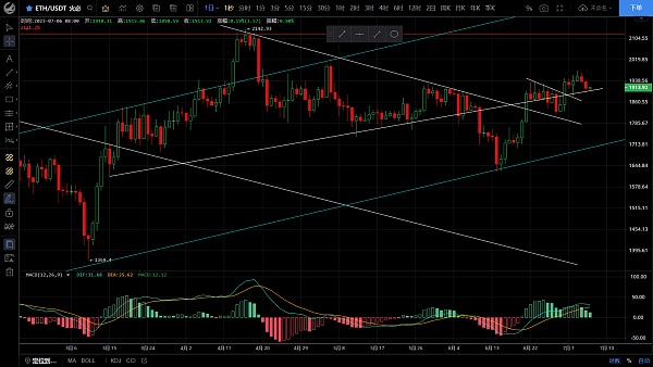 以太坊昨日下跌至1894一线支撑反弹,随后行情陷入震荡,波动不大整体围绕1910附近上下活动,目前币价在1911附近运行,四小时级别行情两次回踩至下方ma90均线支撑反弹,macd空头缩量转弱双线死叉向下,短期虽有反弹但力度不大小周期先关注1920压制突破才会延续上行,ma7均线向下指引,目前走势空头占优,日线级别两次回踩趋势线支撑未破,说明多头趋势依然存在,日内关注反弹力度然后先空后多,上方压制1930-1950,下方支撑1880-1860