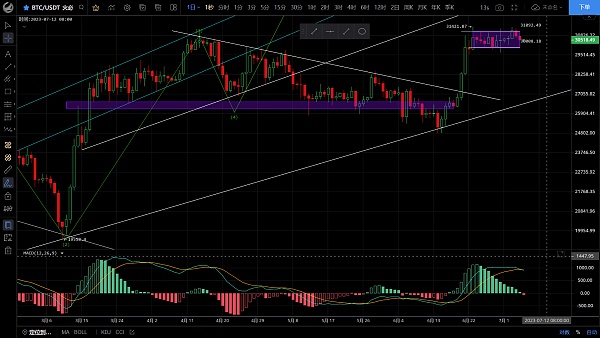 大饼昨日受消息面利空影响行情走出回踩,低位跌至30200附近支撑反弹,恭喜跟上昨日思路的朋友多单小幅获利,目前币价在30500附近运行,四小时级别行情止跌k逐步抬高,macd红色能量柱实心转空心说明空头减弱,ma双线依旧是死叉状态,整体来看行情较为反复短期偏震荡的概率较大,下方关注30000关口破位有机会下行至29500区域,日线来看走出空头排列,多头逐步缩量转空双线呈高位死叉,实体收线在ma7下方,日内走势偏向空头,思路建议反弹后先空后多,上方压制30700-31000,下方支撑30200-29800