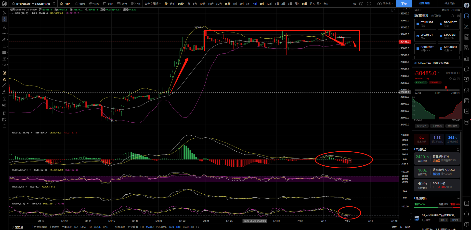 昨日大饼,早磐持续窄幅震荡,午后空头逐渐发力,价格逐步回落,小时线更是走出9连阴,跌幅持续到晚间,最低来到30200一线,直至美股开磐才止跌,随后开始走震荡,呈慢涨趋势,不难发现,大饼价格冲高又回落,依然活动于震荡区间,现币价位于区间中轨处,四小时级别来看币价在小幅度回踩后有所回调但力度不大,K线位于布林线下轨处,MACD呈死叉向下空头放量,KDJ三线粘合,总体更偏向于主空建议高位空。