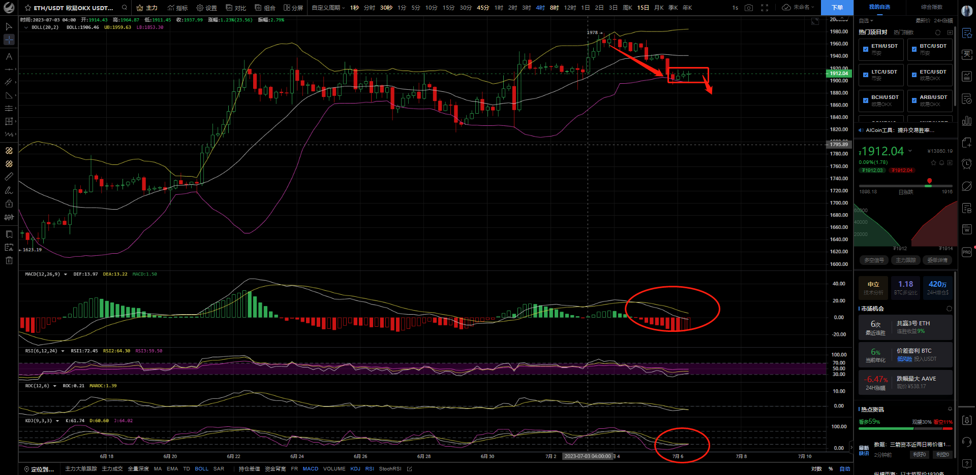 昨日以太凌晨在受压1960后凌晨迎来一波小幅调度下跌后进入震荡,下午再次迎来了下跌,在美股开盘后止跌最低触底1893进入了不断的短区间多空来回震荡,等待行情走出,目前币价位于1910附件波动,四小时级别来看K线下下跌后有所小幅度的多头回调但力度还是非常的小,位于布林线下轨处,MACD呈死叉向下空头不断放量,KDJ三线粘合,在未能走出单边行情的情况下,建议还是在区间内去做单,目前来看上方1920有所受压下方未能突破,短线建议1930-1950空 看下方 1880-1895位置 。