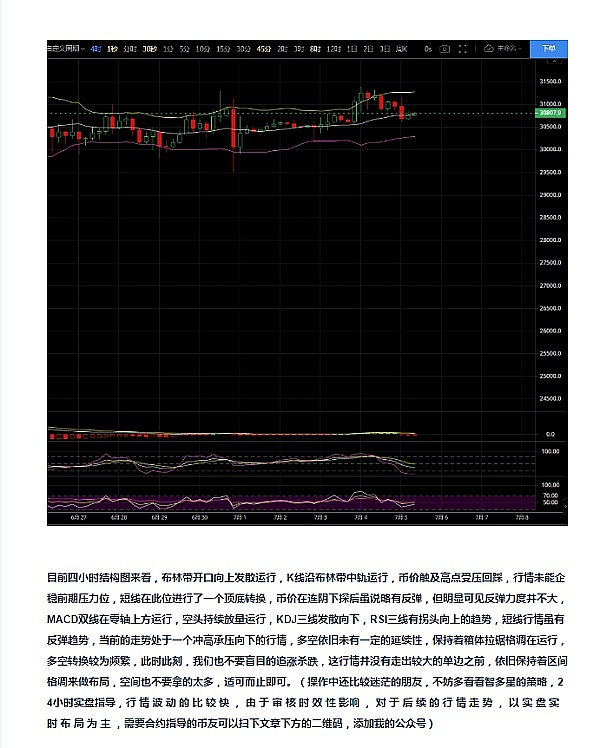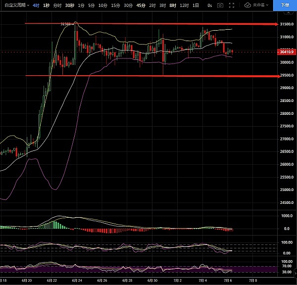 从四小时结构图来看,可看出近期空头情绪是要比多头稍微强烈一点,前期千点的波动一天就能跑完,但是目前来看两天走完一个区间之后下方多次试探未能刺破就可以考虑反手做多了,下方一线支撑暂且关注30100。布林带开口运行,币价冲高受阻于前高,有效压力导致行情再度回调,目前币价沿布林带中轨下方运行,整体走势依旧保持在震荡区间里运行,大方向并未发生变化,MACD快线已穿过0轴下方,空头能量柱开始缩量运行,KDJ三线有拐头向上的迹象,RSI走势比较焦作,整体走势是来看我们日内思路可继续围绕着回踩看涨来进行布局。