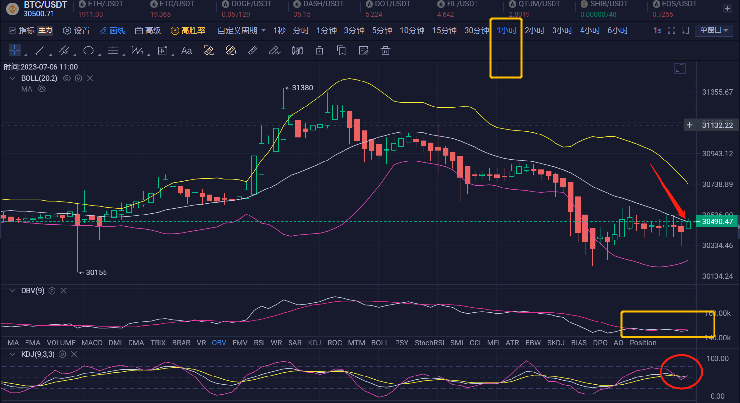 短线合约防面当前小时线走势价格整出在布林中轨31500附近,K线走势在此区域连续横盘整理围而不破,短线上方卖压还在。OBV能量潮指标当前快慢线反复粘连线头平行延伸,也符合了当前部分的K线形态趋于盘整态势!KDJ盘中动态指标所反应当前走势较为灵敏,J线下穿K,D周期线后底部形成反转目前形成拐头上行贴合K,D线。 走势方面多头局部短线有震荡上扬趋势。