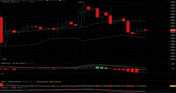 目前小时级别图来看,布林带向下缩口运行,K线沿布林带中轨下方运行,MACD均线粘合向上运行,多头能量柱持续放量状态,KDJ三线金叉向上发散运行,各指标显示多头趋势,币价受中轨压制反弹无力,整体走势上看,31000依然是多头想要进一步打开空间的关键,只要日线能够有效企稳,新高基本属实,所以日线趋势上我们依然保持看涨的思路不变,短线上昨日回踩30200小幅反弹,但是反弹力度同样偏弱,日内继续关注此位置支撑情况