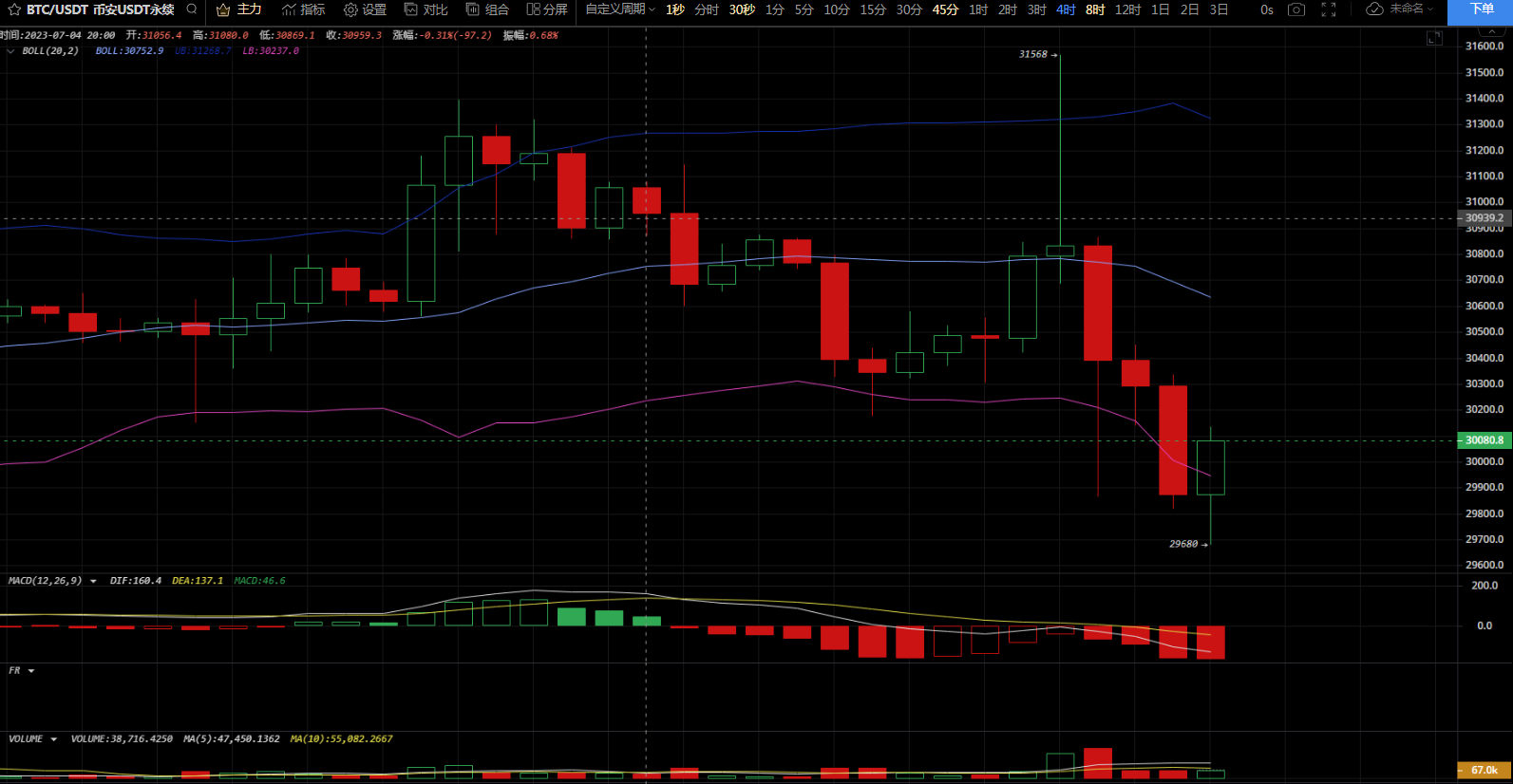 BTC:31000-30800空单进 目标30000-29800 止损31300
