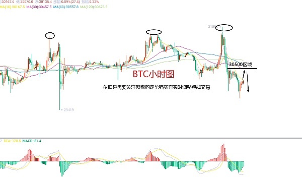 7月7日比特币(BTC)合约技术面分析:今日方面,大周期日线级别昨日报收小阴线,K线形态上连阴下跌,附图指标死叉向下,但是目前还没有力度出来,且价格依旧是处于高位,前期的低点位置在29500区域,也是今日早间回撤的低点位置附近,而高点位置在30500和31500两个位置;短周期小时图昨日欧盘冲高回落凌晨延续早间探底后支撑横盘修正,当前K线形态连阳,行情而不是积弱,所以不能直接空,昨日美盘修正的高点位置在30500区域,因此今日BTC短线合约交易策略:反抽30500区域空,止损30800区域,目标看29800-29700区域;