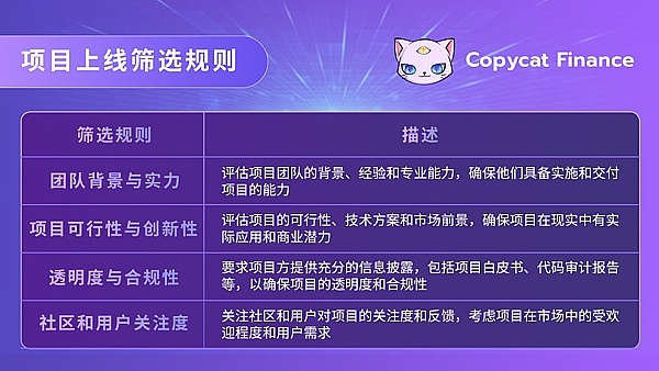 作为下一代去中心化交易平台,Copycat致力于解决这一问题,通过严格的项目筛选规则和策略,为优质项目提供初期的支持和推广,让它们获得更广泛的曝光和投资机会,同时为投资者提供更多选择和机会。