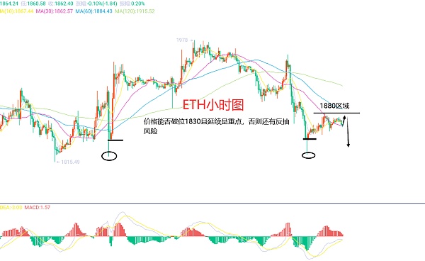 7月8日以太坊(ETH)合约技术面分析:今日方面,大周期日线级别昨日报收小阳线,价格还是在高位震荡,K线形态连阴单阳,附图指标死叉向下,但是注意昨日是以修正为主的走势,没有延续下跌也没有爆发探底,那么下方1830区域支撑就是重点,破位且站稳下方那么才会顺利延续,否则还是有反抽的风险;短周期小时图昨日美盘反抽高点1880区域,前期修正高点1900区域,低点支撑1830区域,这就是需要注意的几个点位,因此今日ETH短线合约交易策略:反抽1880区域空,止损1901区域,目标看1840-1830区域;