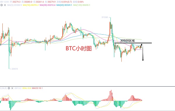 7月8日比特币(BTC)合约技术面分析:今日方面,大周期日线级别昨日报收小阳线,价格还是处于高位横盘整理,而当前价格在均线阻力位置,附图指标死叉向下,就比较矛盾了,昨日如果顺势延续,那么需要等的就是爆发了,而当前一方面要看延续,另一方还要注意爆发以及反弹的力度;短周期小时图就没什么说的,昨日早间探底回升后维持震荡,美盘小幅拉升后横盘,当前价格不动,所以就只需要关注高低点位置就可以了;因此今日BTC短线合约交易策略:反抽30500区域空,止损30800区域,目标看29800-29700区域;