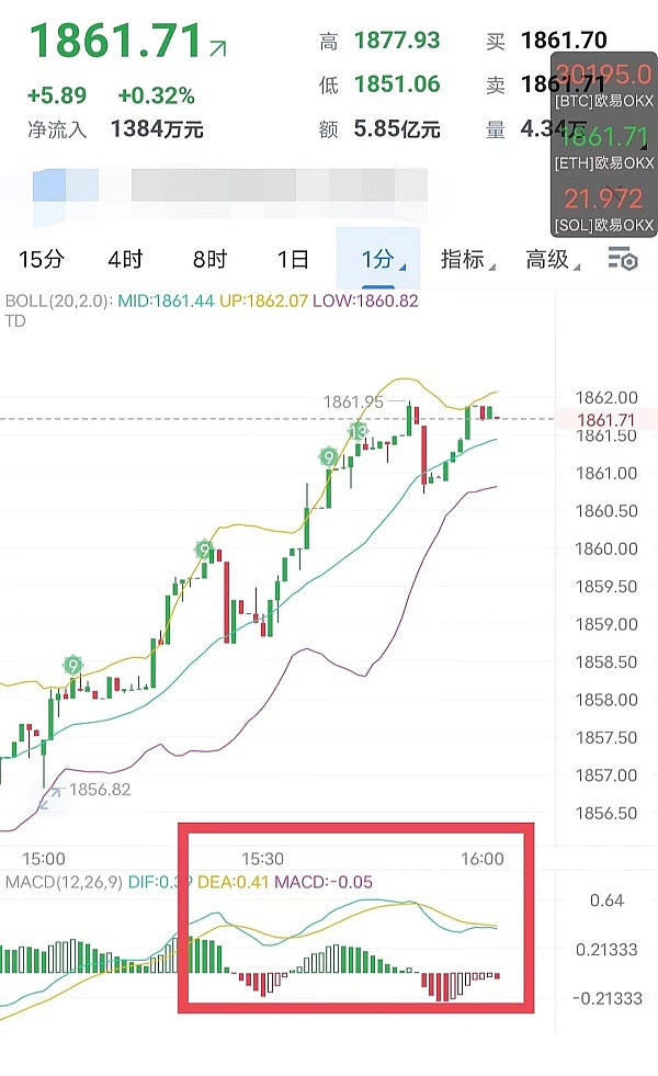 方式:MACD的金叉死叉,MACD黄白线的发散和收敛,穿越零轴,双均线回拉零轴。