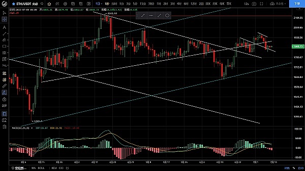 以太坊昨日走势和大饼一致,波动不大整体围绕1860附近活动,凌晨空头发力下跌至1841一线收阳反弹,恭喜跟上昨日思路的朋友,目前币价在1869附近运行,四小时级别走势和思路一致回踩至趋势线支撑附近开始反弹,k线连阳,macd多头运行双线金叉状态,短期虽偏向多头但反弹没有力度,上方1880阻力依旧有效,未突破前依然看震荡,日线来看k线收阴有下影线,macd空头运行双线死叉向下,盘面走势仍有再次下跌的可能,重点关注1840能否破位,有效跌破将延续下行,周k若收线在1850下方下周建议反抽做空为主,上方压制1880-1910,下方支撑1840-1800