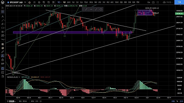 周末行情波动不大,昨日整体围绕30300附近上下活动,凌晨回踩至30049一线支撑反弹,恭喜跟上昨日思路的朋友,目前币价在30288附近运行,四小时级别行情呈横盘整理阶段,多空反复没有延续,macd多头运行但量能不足双线粘合,上方30400阻力区域未突破前依旧是震荡调整,日线走势没多大变化,上方ma7和14日均线压制无法突破,macd空头运行,整体思路依然倾向于震荡下跌,若能跌破周k前根低点,下周则反抽做空,白盘没多大行情思路建议观望为主,上方压制30500-30800,下方支撑30000-29700