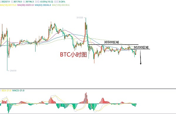 7月10日比特币(BTC)合约技术面分析:今日方面,大周期日线级别昨日报收小阴线,K线形态上连阴单阳,但价格还是运行于高位横盘整理,下方低点支撑位置29350区域附近,附图指标死叉向下没有爆发就没有动能放量;短周期小时图连续三个交易日价格要价反抽30500区域承压回撤,低点位置在29900-29800区域,那么这就是今日我们需要关注的支撑位置和压力位置,所谓事不过三,不破不立的原则,所以欧盘就是重点,因此今日BTC短线合约交易策略:现价30200区域直接空,止损30500区域,目标看29500-29300区域;如果欧盘反抽破位30500区域,晚间再做调整。