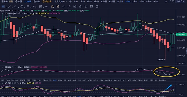 从小时线来看,一波空头完结于布林下轨后当前反弹站稳下轨支撑30080上方。极短周期迎来小波回升,OBV能量指标快线下穿周期线后波动上行靠近周期线,盘中止跌回升。但触及上方中轨30240附近又承压回落盘整。KDJ方面当前J线在小时周期走势里上穿K,D周期线后大角度上行。 局部走势有反复冲击布林小时中轨30240动能!