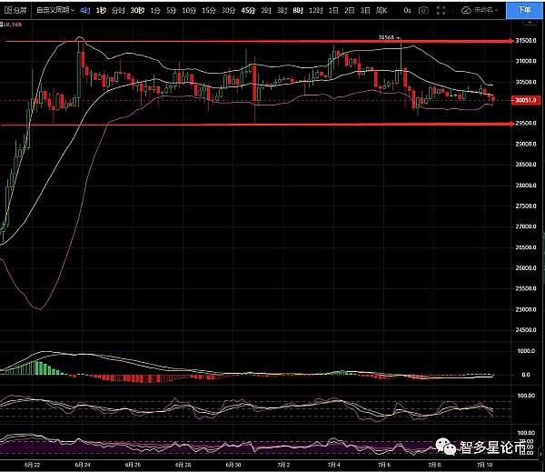 通过4小时级别来看,目前行情从拉高到现在已经有19天了。在前面所有的震荡中基本是哪个都是震荡二十几天就要变盘了,那么目前已经很接近了。而这段时间的行情基本上都是在围绕3W附近来回震荡,不过这样也好像做房子。首先第一步就是要把地基打牢,多花时间,上去的空间就自然也大了,目前比特币继续围绕四小时箱体震荡,上方最高测压31500,下方最低支撑29500,上下两位置将是多空分水岭,当币价试探29500此位置都收了长影线,并未有效形成突破站稳,布林带缩口走平状态运行,币价在大阳小幅度拉升过后快速回落收二连阴形态调整,但给到回踩的力度并不是很大,整体还是处于震荡区间运行,币价有在30000附近筑底的趋势。币价一直保持在高位运行,且不断突破近期前高,虽然破位后又迅速承压回落,但是我们可以明显的看到,目前空头回调无力下方支撑强势。目前来看多头趋势仍在。日内操作思路继续保持低多为主进行布局即可