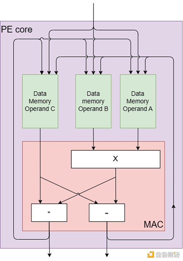 每个PE都设计了一个内核,其中包括模乘法器、加法器和减法器,如图2所示。这些核心组件的灵感来自数字信号处理(DSP)和其他计算系统的基本处理元件,乘法累加(MAC)引擎。MAC引擎有效地执行乘法累加运算,包括将两个数字相乘并将乘积加到累加器中。