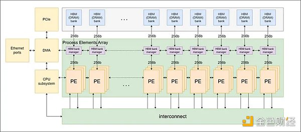 该架构还集成了片外高带宽内存(HBM),以支持高内存容量和高内存带宽。将多个PE聚在一起组成一个PE集群,每个PE集群与一个HBM bank或信道相连。此外,还包括一个基于ARM的片上CPU子系统来管理整个系统操作。