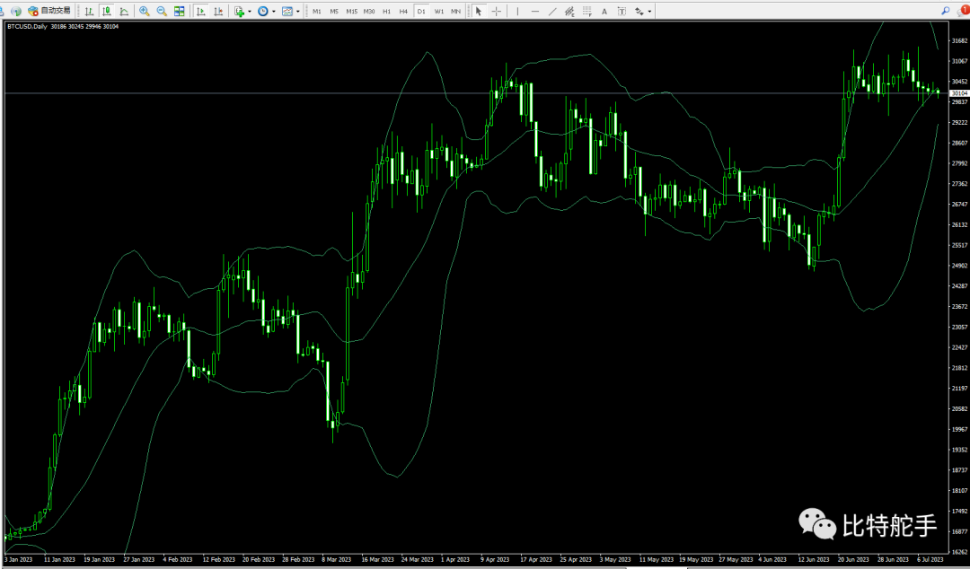 比特币上周周线以上影线略长,短下影线的小阴线实体报收。整周波幅29700--31500 整周1800点的波幅。价格持续维持在4小时的横盘震荡。周末2个交易日几乎无波动。4小时布林带缩口短线仍然处于弱势运行。上周四31500刷新前面两周高点之后,马上出现大阴,日线6连阴,盘中始终无反弹。哪怕短暂的反弹都没有。但是价格也并未破位横盘价格区间。价格短线仍然焦灼于横盘区间内。市场流动性仍然不足,走势缓慢,价格波幅区间小。