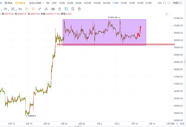 比特币目前价格31,100附近,下方重要承压29,500,上方承压31,400附近,持续的高低点宽幅震荡接近20天,我们暂时没有比较好的理由,认为行情可以去带来一波幅度性的下跌,虽然说短期多头有受阻的迹象,但是下跌依然没有任何动能,日线级别来看,上一波行情幅度性上涨,KdJ 指标D指进入超卖区,行情幅度,性拉伸6500个点,本轮行情31,500进入超买区,,D指就已经从80跌至39,行情下跌不过1500点,所以多空力量的对比,短期依然是多头趋势中进入一个小小的调整阶段,后续操作依然可以低多考虑。