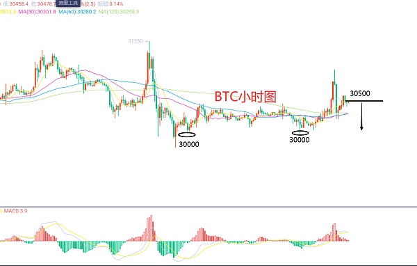7月11日比特币(BTC)合约技术面分析:今日方面,大周期日线级别昨日报收小阳线,K线形态上单阴单阳价格运行于高位不破高不破低区间震荡,附图指标死叉向下没有力度和延续,目前空头动能有些缩量了,而昨日反弹对于空头来说就是没有延续和站稳,否则会更难;短周期小时图从昨日欧盘开始价格震荡上行,美盘延续凌晨价格承压早间回撤,起涨点30000区域,高点31000区域,这样来看今日我们需要做得就是关注高低点的破位情况了,交易重点还是在欧盘,因此今日BTC短线合约交易策略:现价30500区域短空,止损放在30750区域,目标看30000区域,下方关注30000区域破位情况,不破可以接多,止损放在29700区域,目标看30500-30800区域;破位则放弃多;